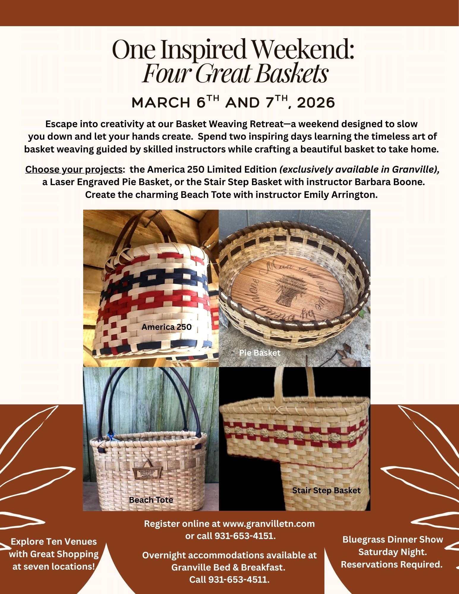 Plan to spend the weekend in Granville on March 6th and 8th. Sign up for one or more of these great workshops and take home a beautifully crafted basket that can be a useful in your home or just as a decorative accent.