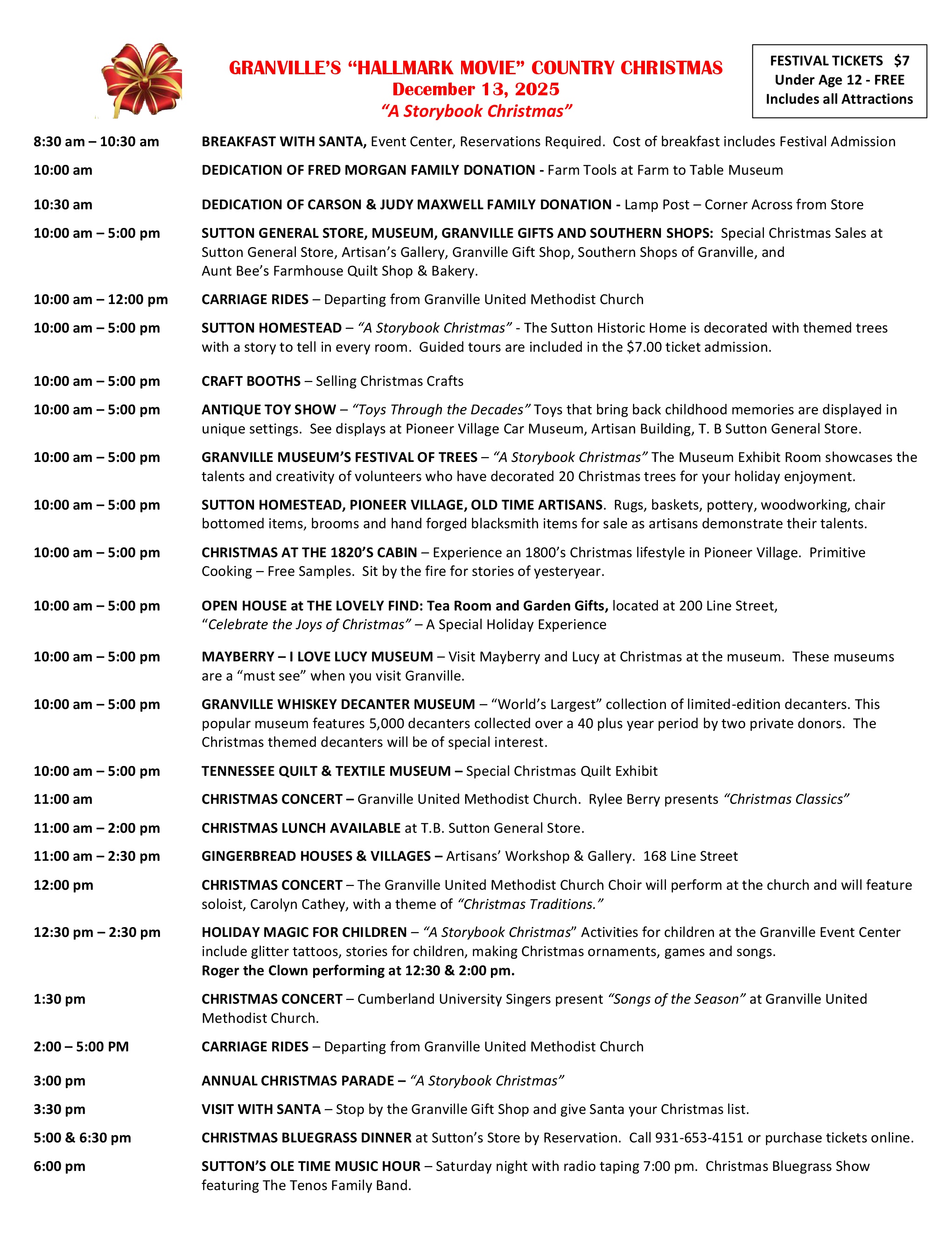 Our Country Christmas & Parade will make you feel like you have stepped back in time to a place where life was so much simpler. Our theme for 2025 is "A Storybook Christmas." Discover again the magic of the holiday season by celebrating with us in Granville. Last year, Granville was selected as one of six Best Towns in Tennessee for Christmas, and we will be committed to that in 2025. Please make plans to join us for the decorations, the music and activities for all ages including a parade and a visit by the man himself, Santa Claus. A $7.00 Festival Fee entitles you to access all Granville attractions.