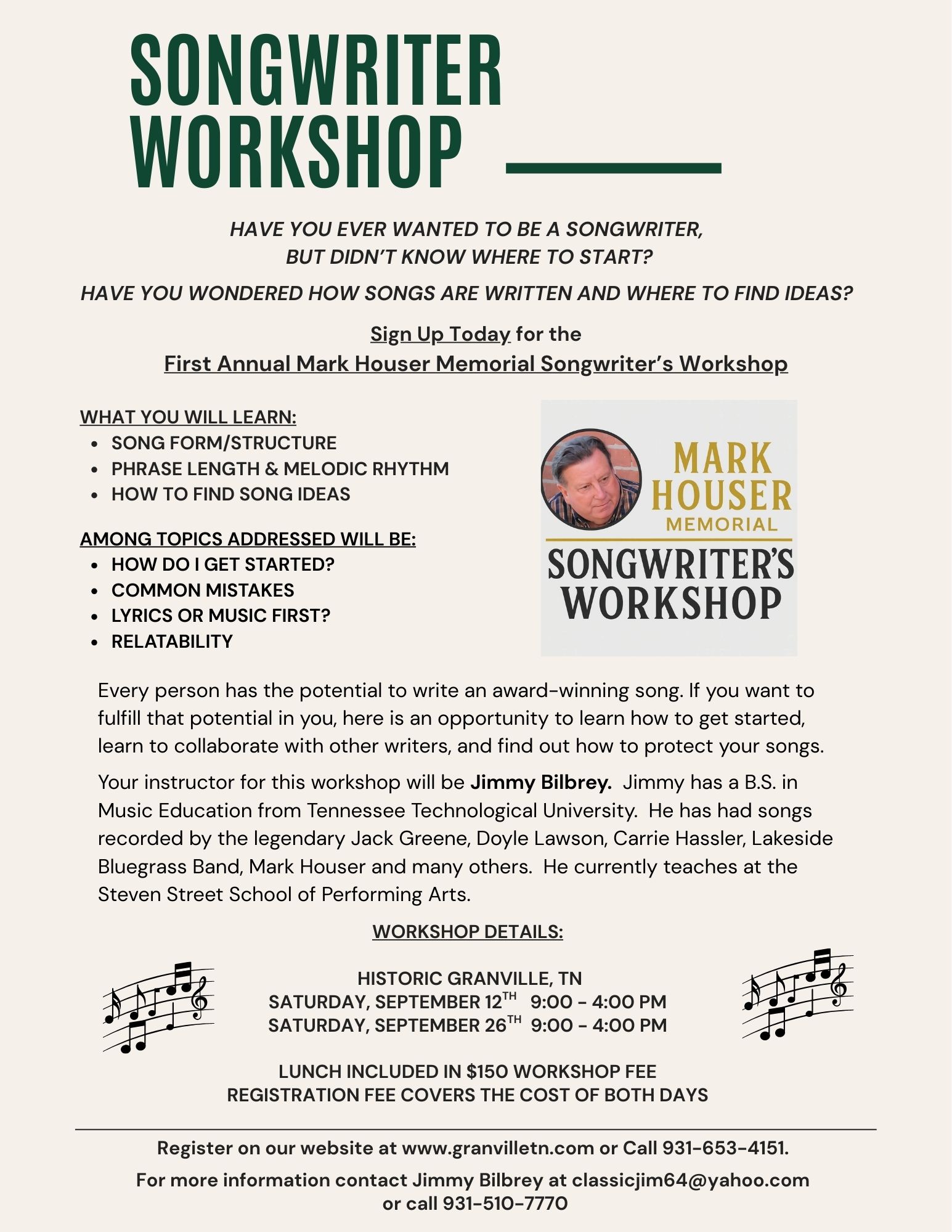 This fall, Granville is hosting a two-day workshop designed to spark creativity and inspire aspiring songwriters of all ages. Whether you’re just starting out or simply curious about songwriting, this event offers a welcoming place to explore the craft and take your first steps or to sharpen your existing skills.